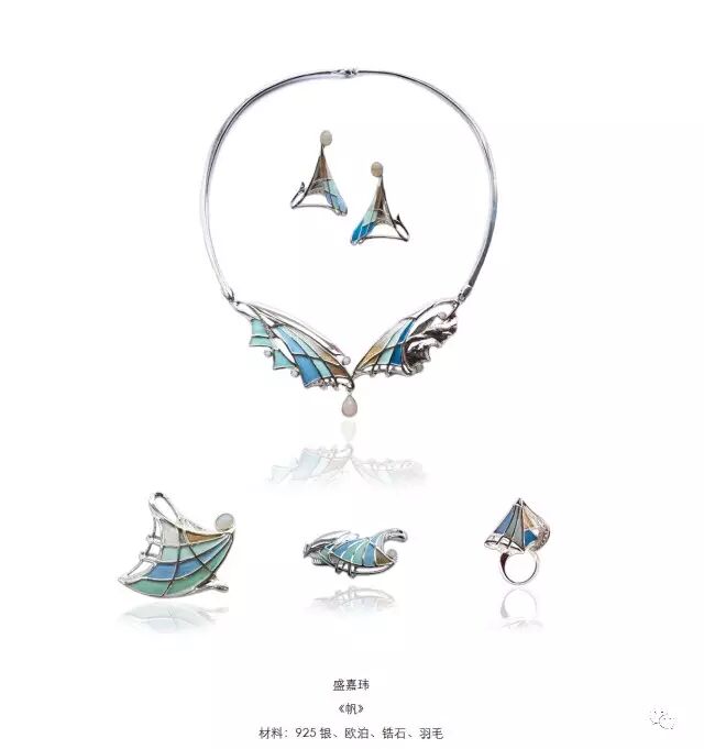 作品靈感來自於帆船的帆。帆的形狀簡潔,帆面大多為三角形或斜桁四邊形,有著簡明流暢的線條,以幾何形狀結合點翠工藝,來達到傳統元素與現代首飾造型相結合的目的。作品中深淺不一的藍色羽毛表現了帆在海面上飄揚,海水在陽光下泛出不同色彩的景象。而作品中被風浪拍打、搖晃、顛浮的帆,意喻了人生航線雖不會一直平平穩穩,但仍要乘風前行。
